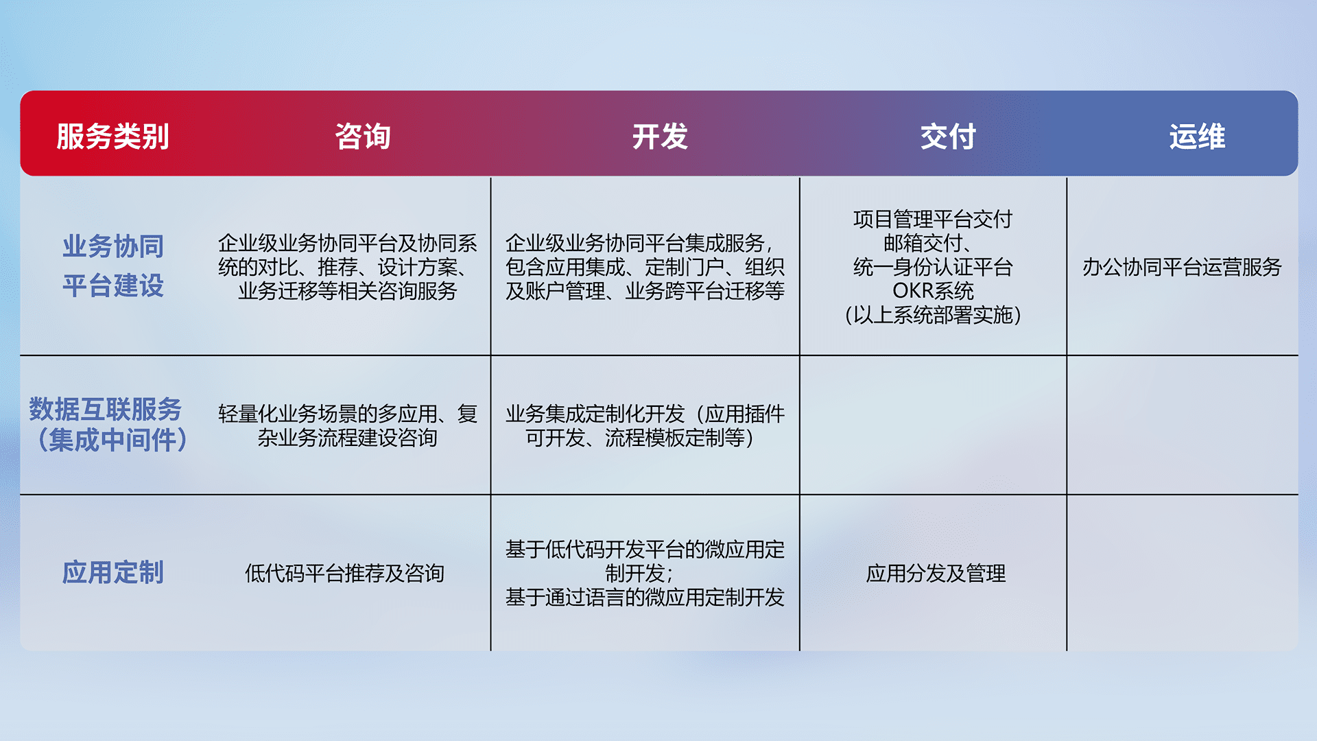 针对钉钉、、、企微、、、、IDaas等平台级产品提供产品的规划、、方案、、、交付、、、、定制化开发等服务,,,实现如统一协同办公、、、、智能客户服务、、混合会议管理、、、、智能数据查询、、等业务场景,,,实现数字化转型。。。